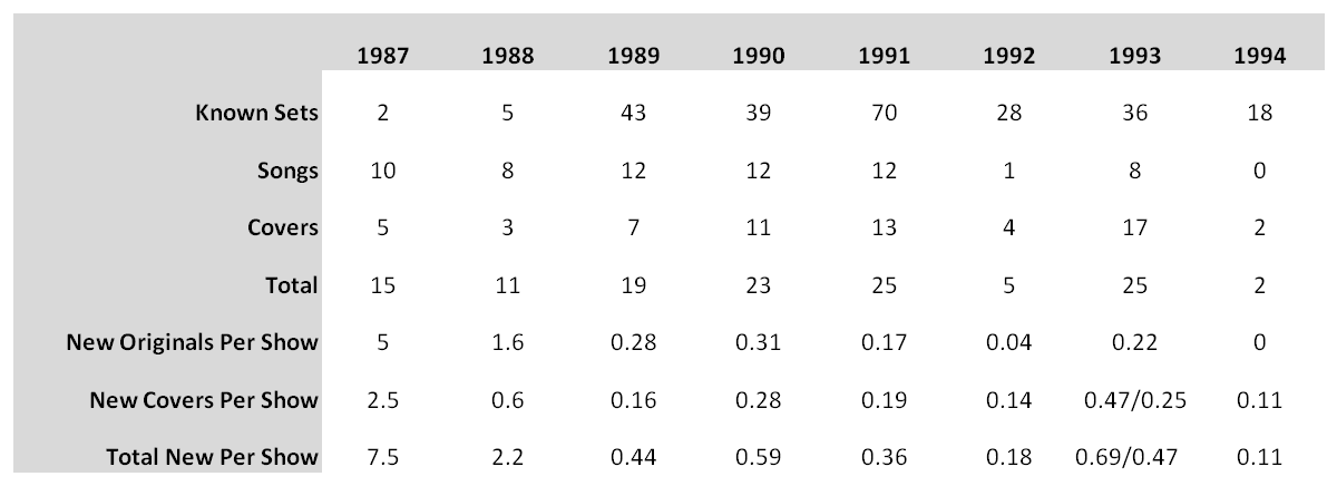 Of course 1987 is irrelevant given how skewed it is by their first performance (all new!), also 1988 suffers from the extensive gaps in the set-list record. The pattern across the succeeding years are fairly solid, however, Nirvana were cranking out a new song ever two/three shows 1989-1991, even the large number of set-lists available for the extensive touring in 1991 can’t substantially dilute the result — this was one hard-working band. It does make 1993 look like a resurgence, heck, Nirvana are pulling fresh originals on stage at the same rate as they do in 1991, roughly one new song for every five shows. The cover number is buoyed up to a ridiculous level by Sao Paolo and MTV Unplugged in 1993. In fact, removing those two shows, each a special circumstance, from the equation and just looking at their ordinary gigs would bring the stat down to 0.14, a fresh cover appearance every ten shows or so, the same as 1992, the same as 1994.