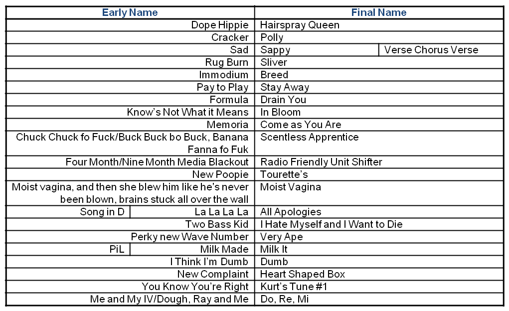 What the list emphasises is that Kurt Cobain did put thought into the details of his music, it wasn’t all just on-the-spot inspiration. It’s also interesting to see him regularly modifying his tendency to make lame quips, opting for more palatable, often more deftly and poetically phrased, titles. There are still further habits and tendencies present.