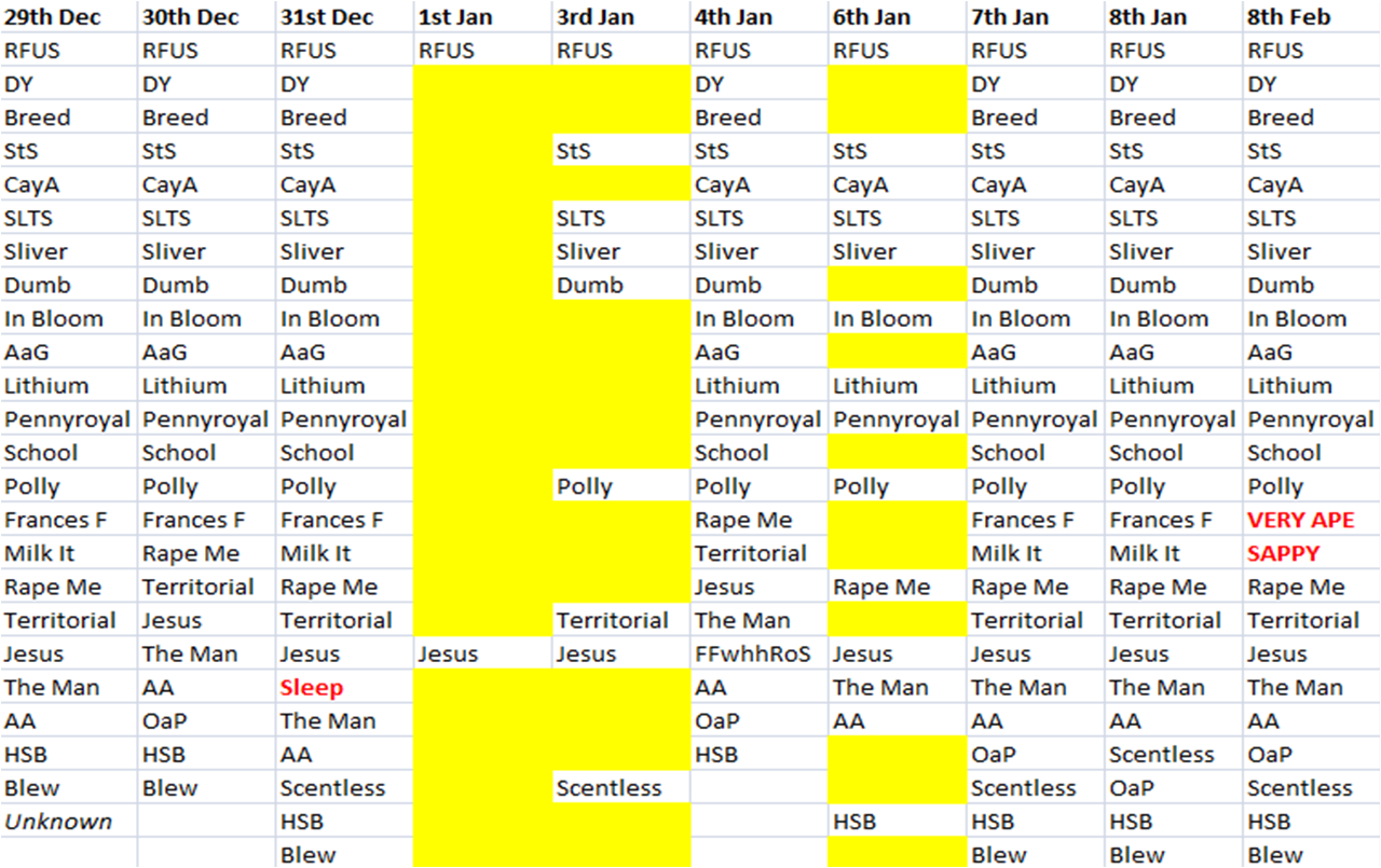 Firstly, an easy one, 1994 — there’s not much left to see. There are three incomplete set-lists but no unknowns. I’ve kept the songs in the order they appear in the Nirvana Live Guide — the guide makes a real point of keeping songs in the order of performance — but the spacing added to January 1, 3 and 6, 1994, the three incomplete sets, is my own. It’s fairly easy, in my opinion, to work out the missing songs: