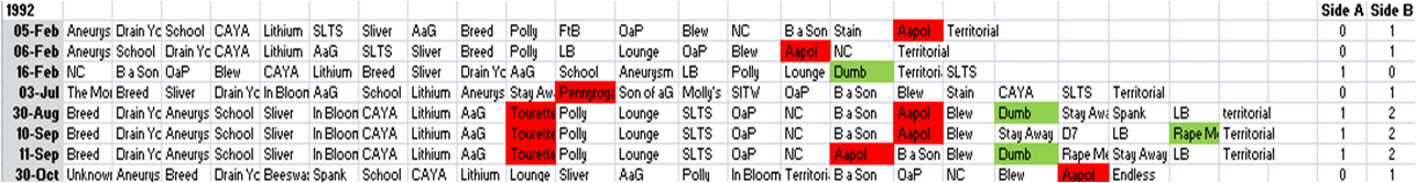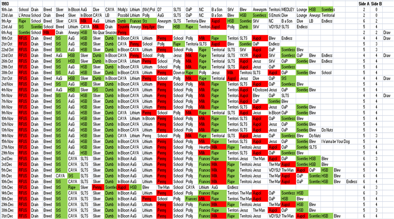 From the very start of 1993, Side A dominance reasserts itself absolutely; 37 set-lists, Side A wins in 32 of them and draws in 5, Side B doesn’t win even once. In one of the few surprises ever thrown up in the history of Nirvana’s 1994 tour, there’s at least one single win for Side B, plus three draws, leaving 14 wins to Side A. As percentages we’re looking at an 86% win rate in 1993 for Side A, or 100% if we wrap in the draws; 78% in 1994 or 94% including draws.