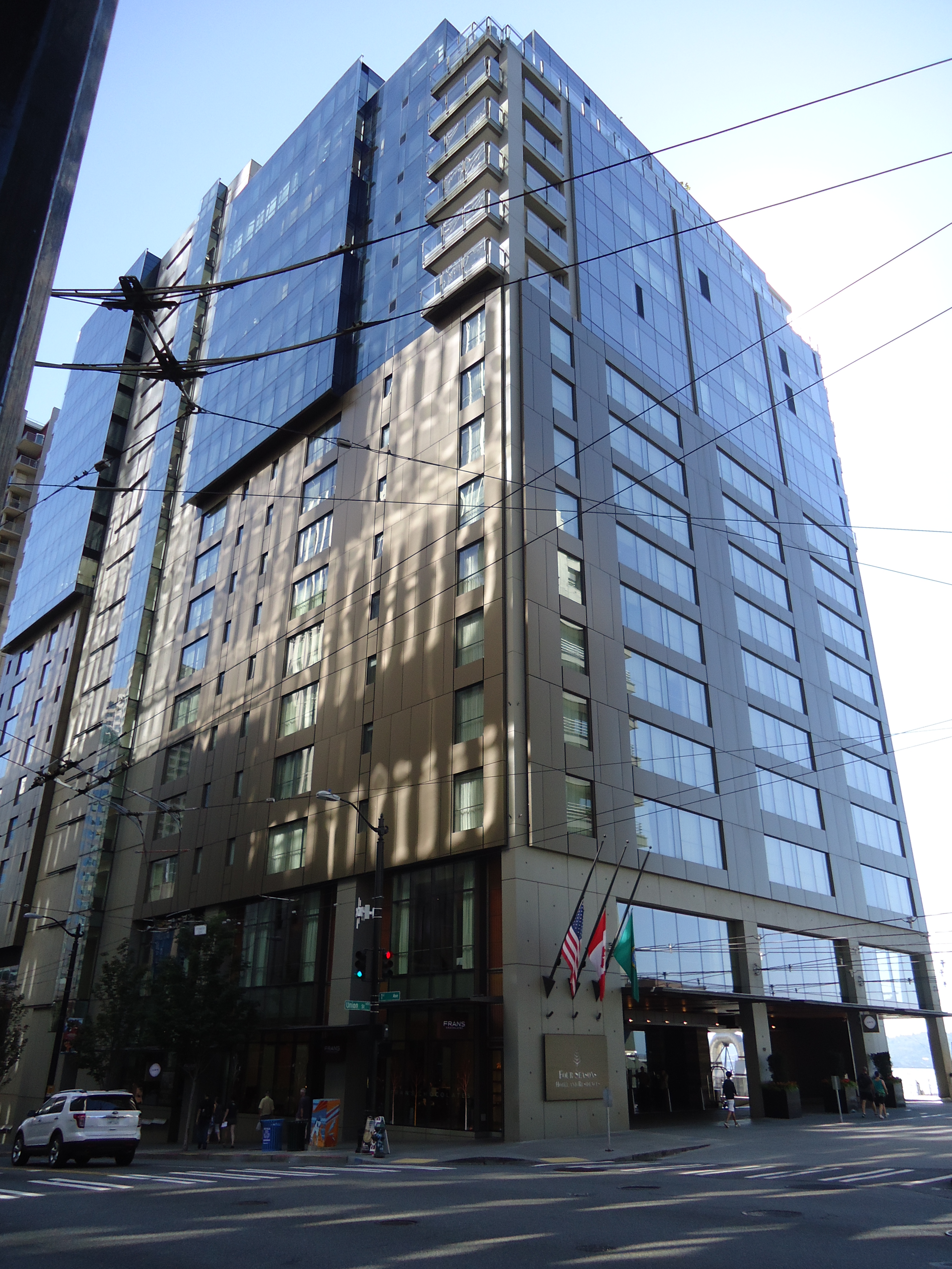Next we reach a rarity, a Cobain residence in the centre of Seattle; the Four Seasons. Unless you’re on an unlimited budget or so far out-of-season you’re permanently wrapped in half-a-dozen layers. Just as a side-bar, Seattleites don’t carry umbrellas — I reckon it’s because the darn things blow inside out so rapidly in these canyons formed by the tall buildings — and they tell me it’s because they’re tough, they wear hats, and they simply put their heads down and brazen it out. Oh, I also noted it’s possible to get quite a distance under cover.