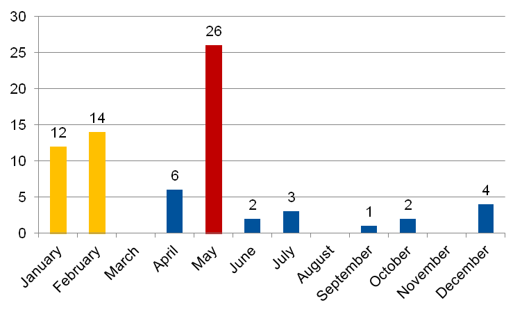 Well…Yeah. Over the years in which the band was in existence, here’s the pattern of which months they recorded in and how many times over that period: