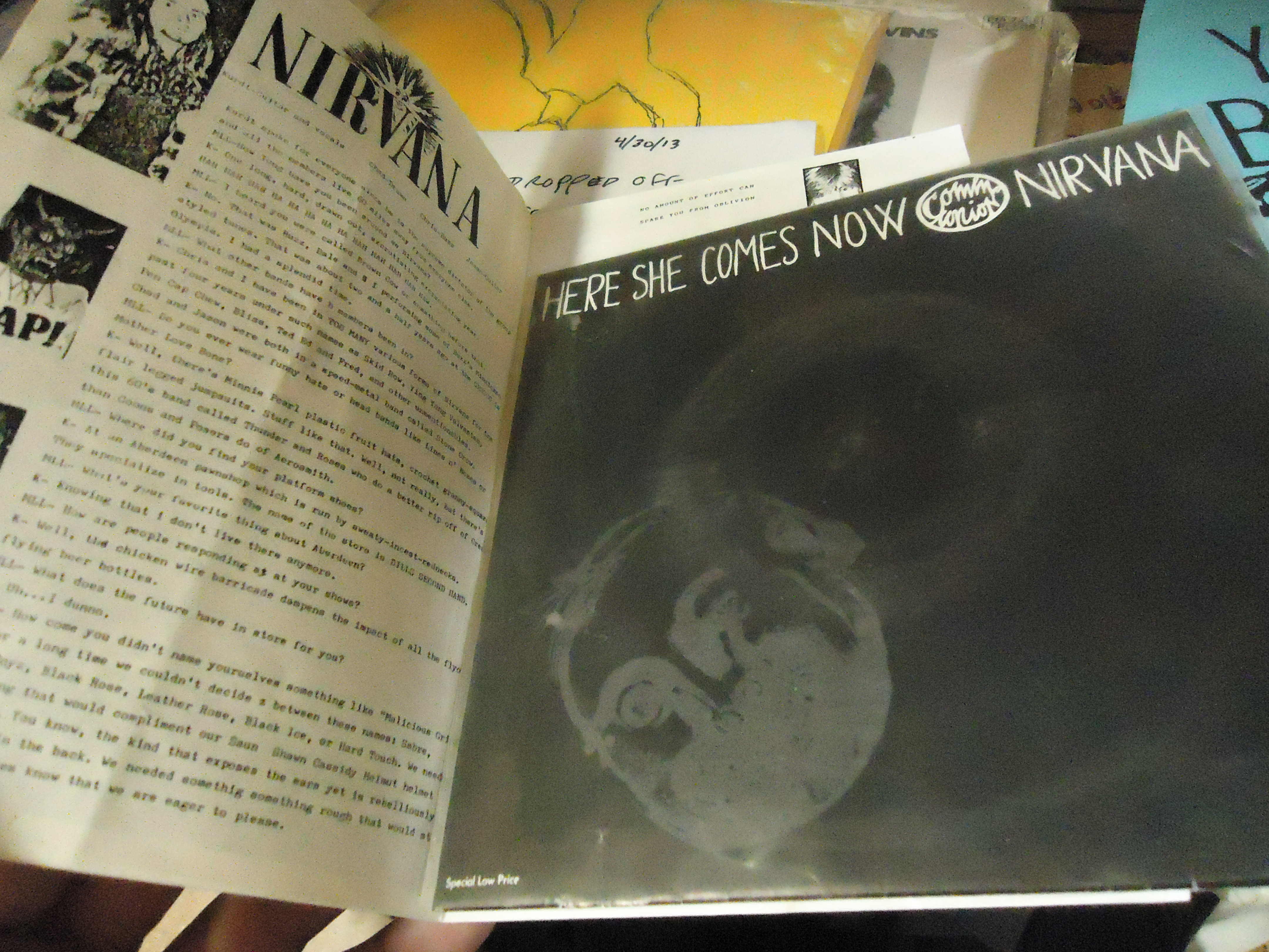 Just a cool guitar signed by a whole series of past members of Nirvana including Dave Foster – a very rare autography, he doesn’t do this kind of thing – that they’re preparing for the Aberdeen Museum…The single below was handed to Mitch by Kurt Cobain personally…Oooooo…handled by the man himself! Oooooo…