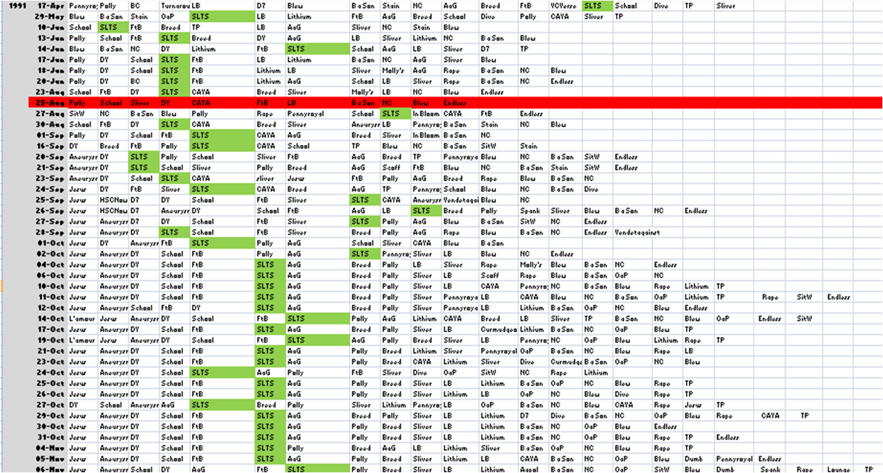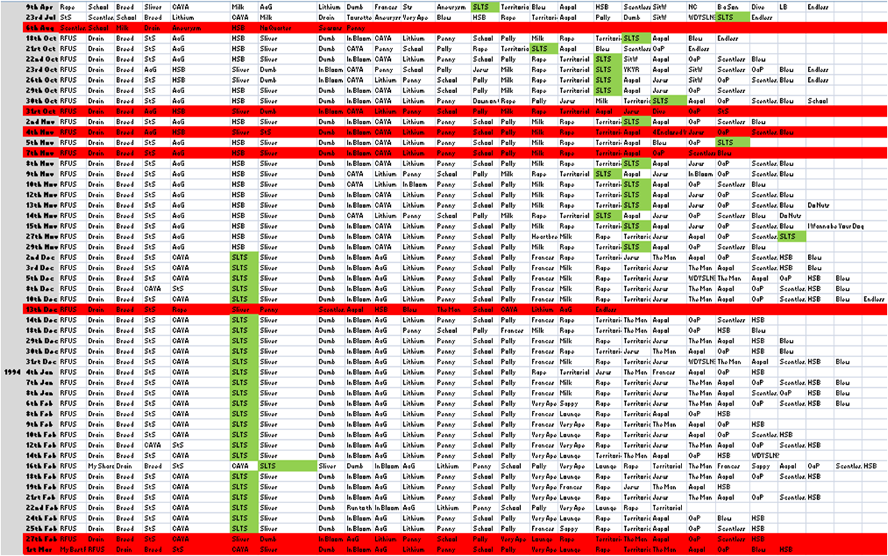 Anyways, it’s clear that, of the nine shows at which Smells Like Teen Spirit wasn’t played, two were definite acts of aggression (Oct 30 and Live n’ Loud); two were because the band didn’t have to please an audience (Aug’ 25, 1991 an Aug’ 5, 1993); two took place within a single week of November with an intervening show at which the song also suffered chaotic attention even though the interpretation of what was afoot at that point is hard to figure out. This all lands us in 1994, the finale. And, in one of those coincidences that look absolutely wonderful in literary writing or media pieces looking for ominous conclusions, the two shows where Smells Like Teen Spirit was not played, were the final two shows of the tour when Kurt Cobain was tired, getting sick, was inquiring about cancelling. There wasn’t much spirit left in him, mirrored in the absence of Spirit on stage. Looks great ending these graphics with a double red underlining…