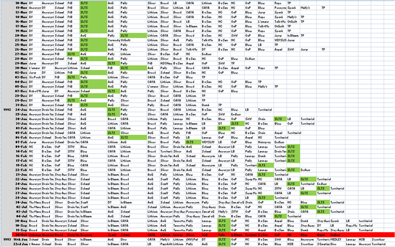 The answer, in a broad-brush way, is “nothing.” Reusing the spreadsheets of complete set-lists (from Nirvana Live Guide) that I used for the Side A/Side B analysis its visible that Smells Like Teen Spirit was played 141 times out of 150 occasions available for us to observe from its debut on April 17, 1991 until the band’s denouement on March 1, 1994. I hadn’t expected any change to occur at first because the song hadn’t yet become the albatross hanging around Cobain’s neck. But there’s never, essentially, a spell when the song is ignored or neglected. The band skip it once on August 25, 1991; they skip it once in 1992 at the notorious October 30 show in Buenos Aires; they skip it five times out of 37 set-lists for 1993; then twice in 1994. That’s it.