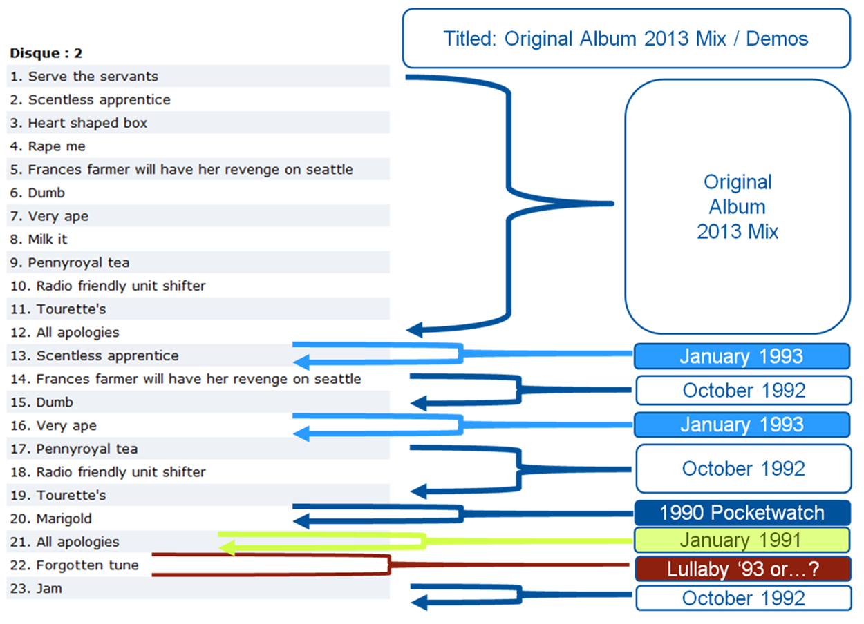 Disc 2: 12 track original album, plus Scentless and Very Ape from Rio, 1990 Marigold, Word of Mouth instrumentals x 5, plus All Apologies (1991?) plus two unknowns = 23