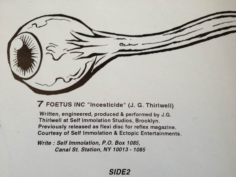 Is there a possibility that Kurt Cobain saw the title on this compilation or heard the song then adopted the song title for his leftovers’ compilation? Well, beyond the dating, beyond the fact that the Incesticide title seems to suddenly jump up out of nowhere and onto the front cover of a Nirvana album in very very late 1992, there’s the various links between the artists on the compilation and Cobain. Nirvana had shared the Dallas, TX gig with Thinking Fellers Union Local 282 in late 1991, Tad were friends (of course), Cobain hadn’t physically met up with Jesus Lizard since a Denver show in 1991 but some contact was ongoing in 1992 in preparation for the planned split-single…Less significantly Nirvana had shared the stage with Barkmarket back in 1990 and with Cop Shoot Cop even further back in 1989 – still quite a range of casual or less casual connections between Nirvana and the bands present on this compilation but, of course, no solid proof that anyone gave a copy to Kurt Cobain sometime in mid-to-late 1992 much though I like the idea of an artist going through a fixation on baby-related medical imagery taking a song title by a performer called “Foetus.” Another excellent little tease from a guy who does seem to like jokes and word games and playing in this way.