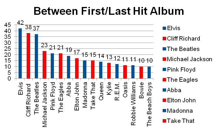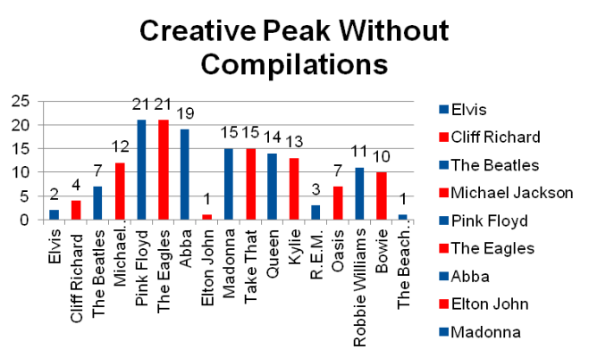 These are the most popular artists in the U.K., bands and artists with a cushion of support that should have sustained them, to some extent, through any fall off in quality and/or popularity. Yet, even with the support each commanded, only 17 managed to stay at the peak for long than ten years. Remember also that the last album for Elvis, Cliff Richard, The Beatles, Michael Jackson, Elton John, R.E.M., Oasis and The Beach Boys was a greatest hits or singles collection — not a brand new album. Without those collections their creative careers fall as follows: