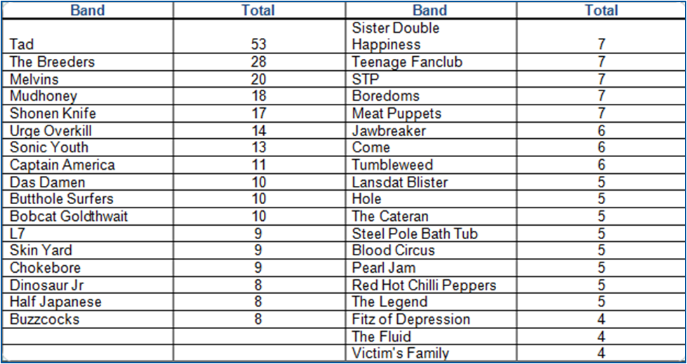 With regard to the absolute numbers, fact number one is the headline figure of 234 unique bands with whom Nirvana played over the course of their time in existence. What’s even more interesting is how few of those bands Nirvana played with more than once. In the table below I set the bar at four times even to allow entry to the list: